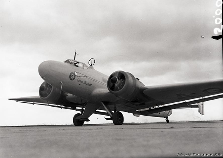 Die foto van die Junkers vliegtuig met die onderskrif: “1946. SAA Junkers Ju-86 ZS-AGI 'Louis Trichardt' on ground with engines running.” Foto: Transnet Gedenkbiblioteek.