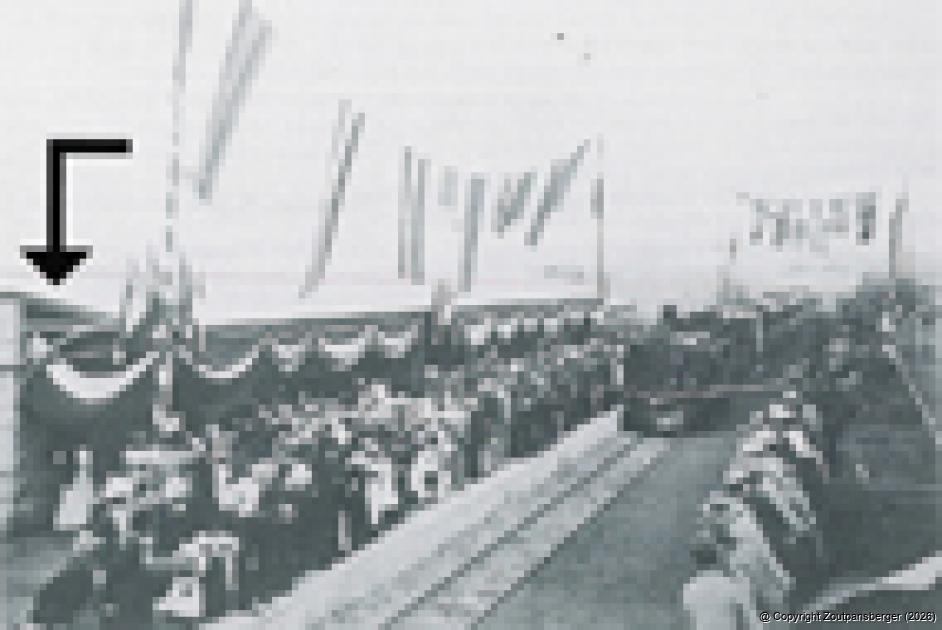The locomotive breaks the ceremonial ribbon at the opening of the Pretoria-Pietersburg railway line on May 1, 1899. See the roof trusses of the station building at the then Pietersburg. This whole building was later dismantled and re-assembled where it stands today, at the Louis Trichardt station.