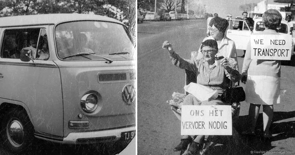 Links: Uit die sestigerjare ... Ons Tuiste Ouetehuis se eerste kombi wat deur Zoutpansberg Motors in 1965 geskenk is. Regs: Tannie Marie Eyssell stoot ‘n inwoner van Ons Tuiste in ‘n kruiwa deur Kroghstraat in ‘n poging om geld vir die tehuis in te samel. Matrone Williams dra die plakkaat op die rug. Die foto is ook tydens die vroeë sestigerjare geneem. Foto's verskaf.