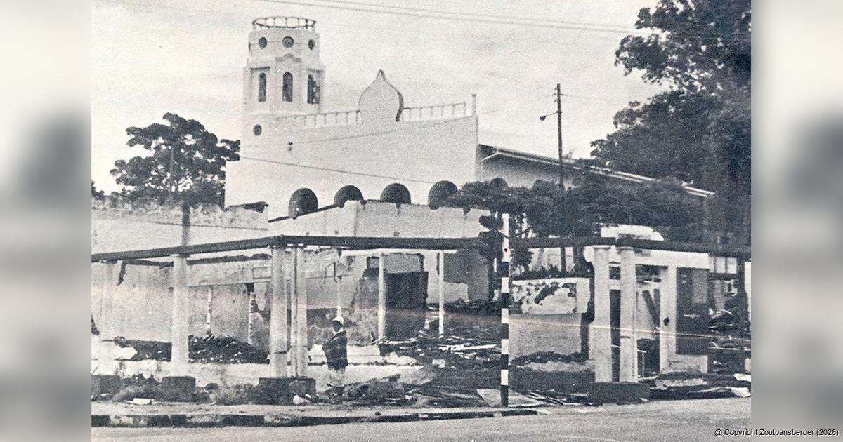 Because of a stipulation in legislation, the Louis Trichardt Town Masjid was spared demolishment in the early 1970s when the town’s Indian community was forcefully removed from the town centre and relocated to Eltivillas. This photo was taken in 1980/81. In the foreground, the demolishment of Indian shops is taking place, but luckily, the mosque survived this terrible part of South African history. Photo: Dopper Kruger.