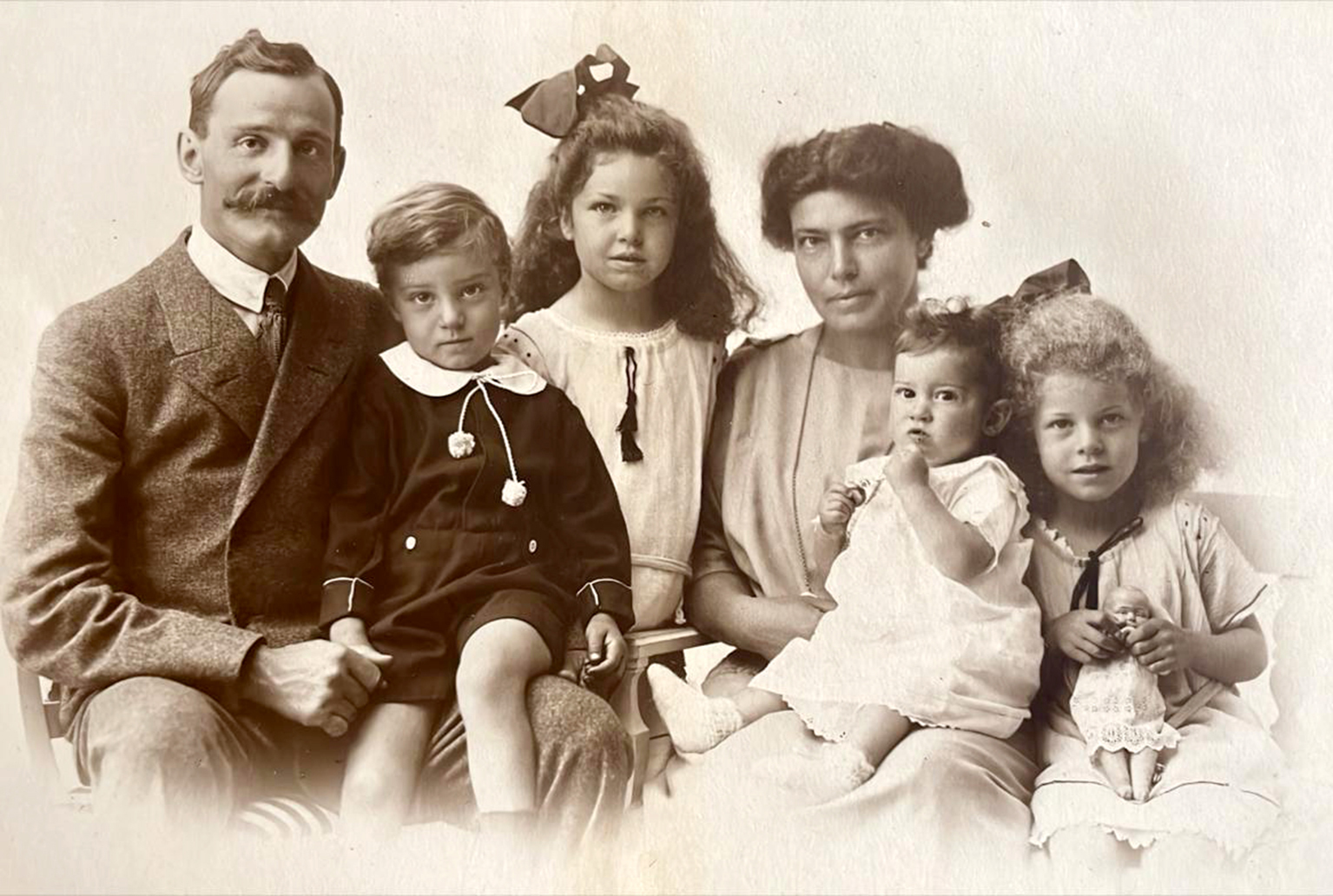 A photo of the Cuénod family taken in Switzerland, before the birth of Claude (who was born in 1924). At the back on the left is René Cuénod with his wife, Marguerite on the right. Between them is the eldest daughter, Jacqueline. Valentine sits on the right, with Pierre Henri siting on his father's lap. The toddler in front is Jean-René. |