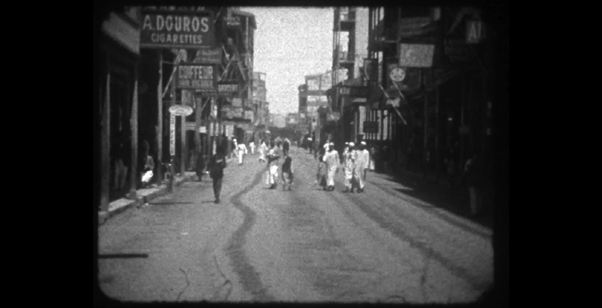 Another scene (0:08:04) captures the spirit of 1920s Port Said — a bustling street view featuring signage in French ("COIFFEUR" for barber) and English ("CIGARETTES"), and a mixture of people in both colonial-era European and local attire. The most prominent sign reads "A. DOUROS CIGARETTES", with several other French-language signs visible. "A. DOUROS" was a well-known Greek-Egyptian cigarette manufacturer based in Port Said and famous during the interwar years.