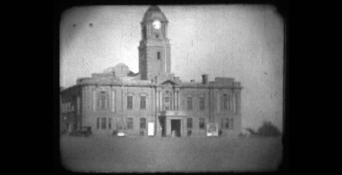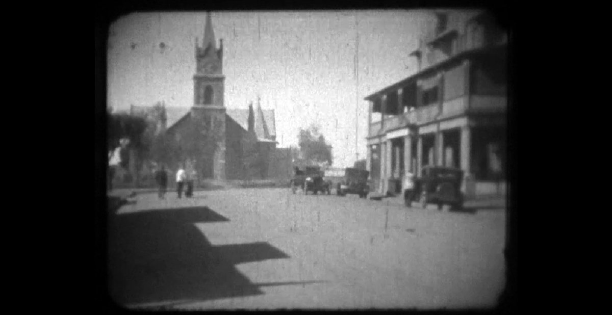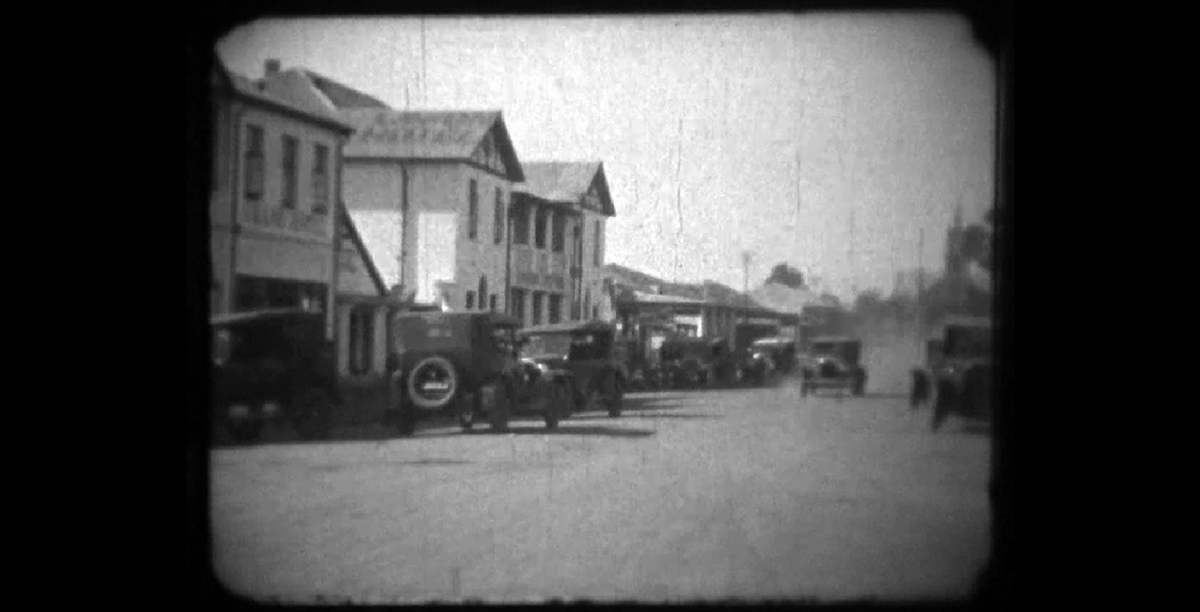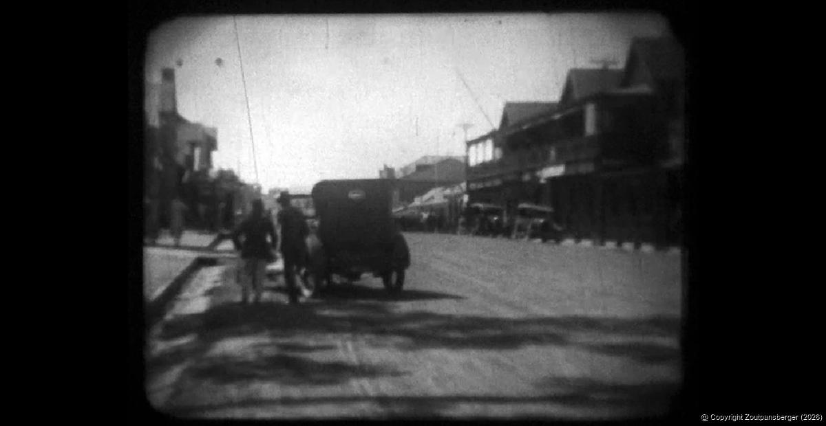 A street scene from the reel depicts the Vrede Hotel in the 1920's. |