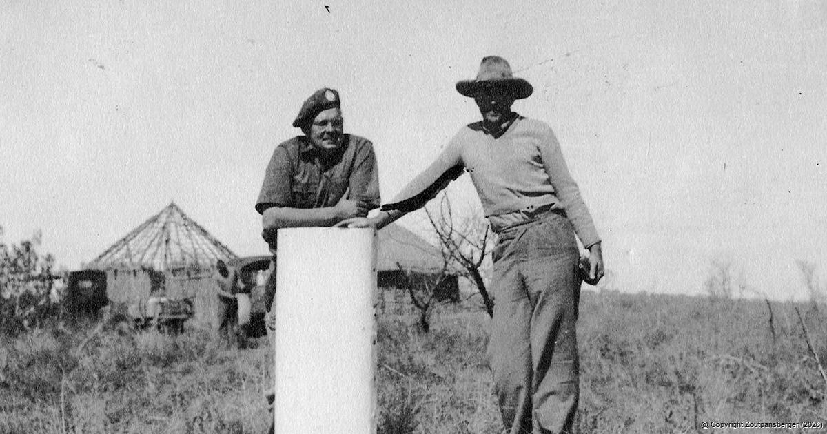 Oom Willem van den Berg (centre), photographed at what may be his farm, with an unknown friend. In the picture he wears his military regalia. He had a passion for the military and was a staunch supporter of the local commando. Earlier in his life, when World War 2 broke out, he was recalled by the Netherlands Army and went for training at Wolverhampton in England. He spent part of the war serving in the Merchant Navy, supporting Allied operations on multiple continents. When he died in 1984, he left some of his belongings and the property to the Moths’ Turbi Hills Shellhole in Louis Trichardt.