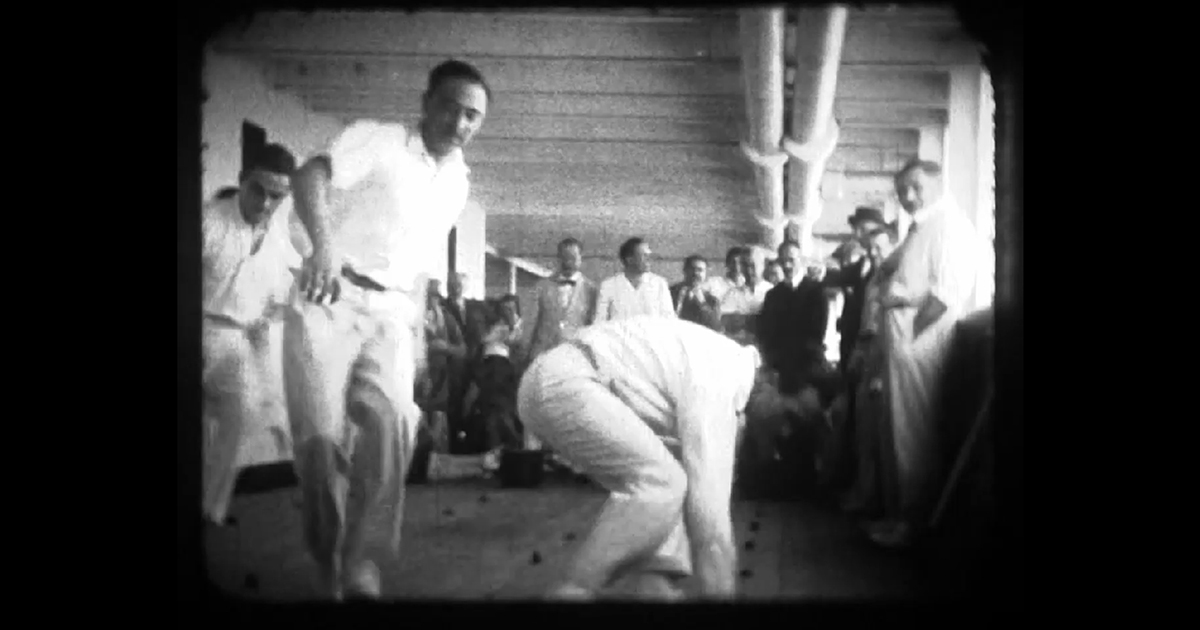 From 01:20, the group is back on board, drinking tea, socialising and taking part in deck games. With no cinemas or organised entertainment, cruise passengers of the 1920s made their own fun. Popular activities included shuffleboard, deck tennis, tug-of-war and egg-and-spoon races. Oom Willem was clearly fascinated by the fun and games – or perhaps his energetic new wife – and filmed much of the action.