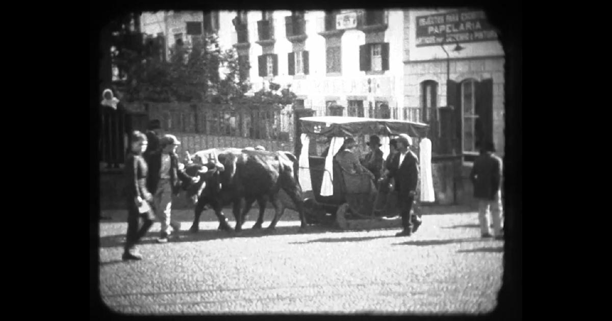 Riding in a ox-drawn sleigh in Lisbon, a sign reading “Papelaria Coelhouse” appears, likely a stationery or bookshop also selling photographic supplies. |