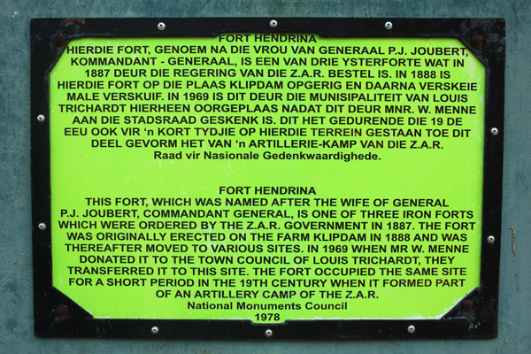 Following this meeting, Joubert came under more pressure not to allow Makhado’s request that such a vast area be demarcated for the Vhavenda. In Boer circles it was felt that Makhado’s behaviour was sending the wrong signal to other indigenous groups and they feared a rebellion. Joubert’s compromise was to strengthen the Boer forces’ area by establishing movable steel forts. One of these was established at Muananzhele, on a farm called Boschkopjes. The fort was named after Joubert’s wife, Hendrina. During the Anglo Boer War period and a few years after, this fort was situated at the current Fort Edward and was also called the same. The fort was later moved and today still stands next to the municipal library in Louis Trichardt.