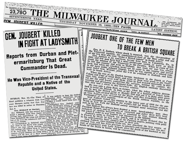 Often when one does research, one starts “at the end”. One looks for the obituaries and then trace back the links. In the case of Petrus Jacobus Joubert, such an obituary appeared in the Milwaukee Journal on 16 November 1899. The main heading of the paper that day reads “Gen. Joubert killed in fight at Ladysmith – Reports from Durban and Pietermaritzburg That Great Commander is Dead.” In the accompanying obituary, he is described as “an American, having been born in Uniontown, Pa, in 1841…” The newspaper further claims that he left the United States at the age of 14 for Holland. He returned in 1861 to take part in the US Civil War, among others as a captain of a coloured company under Gen. Weitzel. “After the war, he returned to Holland, and later went to South Africa.”