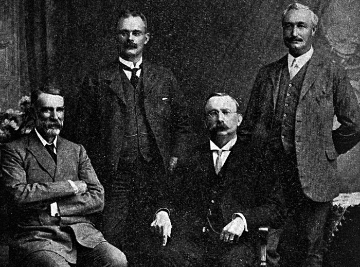 The first Provincial Administrators, 1910. From left to right: Mr Smythe (Natal), Johann Rissik (Transvaal), Sir Frederick de Wool (Cape), and Mr Ramsbottom (Orange Free State).