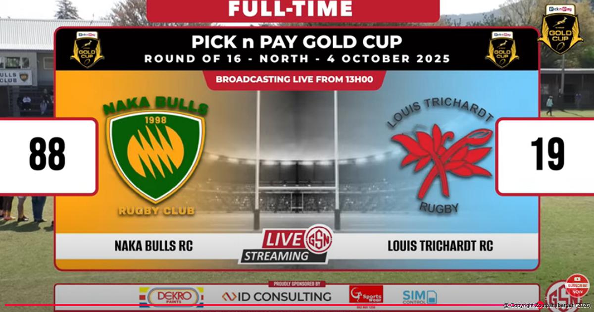 Die Louis Trichardt Rugbyklub se lopie in die Pick n Pay Gold Cup-reeks het Saterdag (4 Oktober) tot ’n einde gekom nadat hulle teen die Naka Bulle, die verdedigende kampioene, in Pretoria vasgeval het. Hierdie is ’n skermgreep van die finale puntetelling tydens die regstreekse stroming van die wedstryd op YouTube.